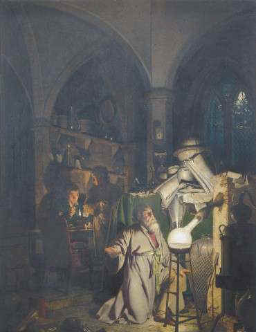 The Alchymist Oil on canvas 50 x 40 in (127 x 101.6 cm) Alchymist's are usually depicted as figures of ridicule as they attempted to discover by experimentation the 'Philosopher's Stone'. This, they believed, would not only cure all known ills in the world, but also turn base metal into gold. Wright appears to be stressing the importance of experimentation, as his Alchymist, no matter what his aims were, has chanced upon the discovery of phosphorus. His two assistants are making lead from ore, in an experiment still practiced today. |